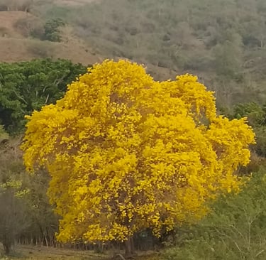 El guayacán se erige como un titán benevolente, su tronco fuerte y rugoso contrasta con la delicadeza de sus flores que parecen oro puro. Es un faro de alegría en medio del gris verdoso de los potreros de los Montes de María, un recordatorio de la belleza que atesora la tierra.